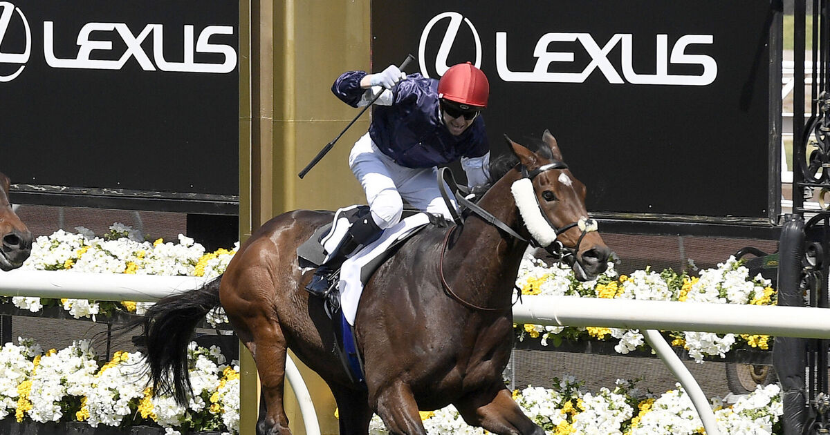 Jockey Jye McNeil mounting Twilight Payment celebrates after winning the Melbourne Cup horse race at Flemington Racecourse in Melbourne, Australia, Tuesday, Nov. 3, 2020. (AP Photo/Andy Brownbill)