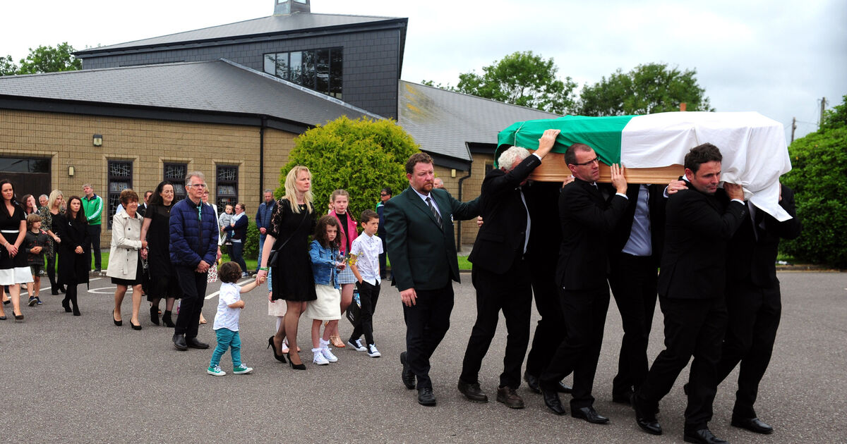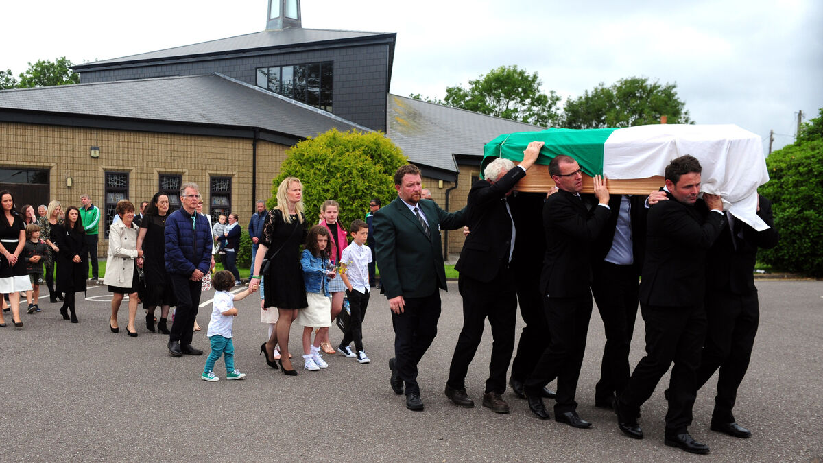 Kieran O'Connor's wife Sinead O'Connor and children James, Ava and Isabelle and his brothers and his father and father in law carry his remains at St Erasmus Church, Aghada. Picture: Eddie O'Hare