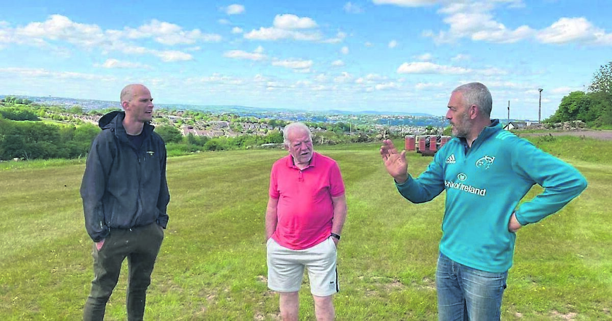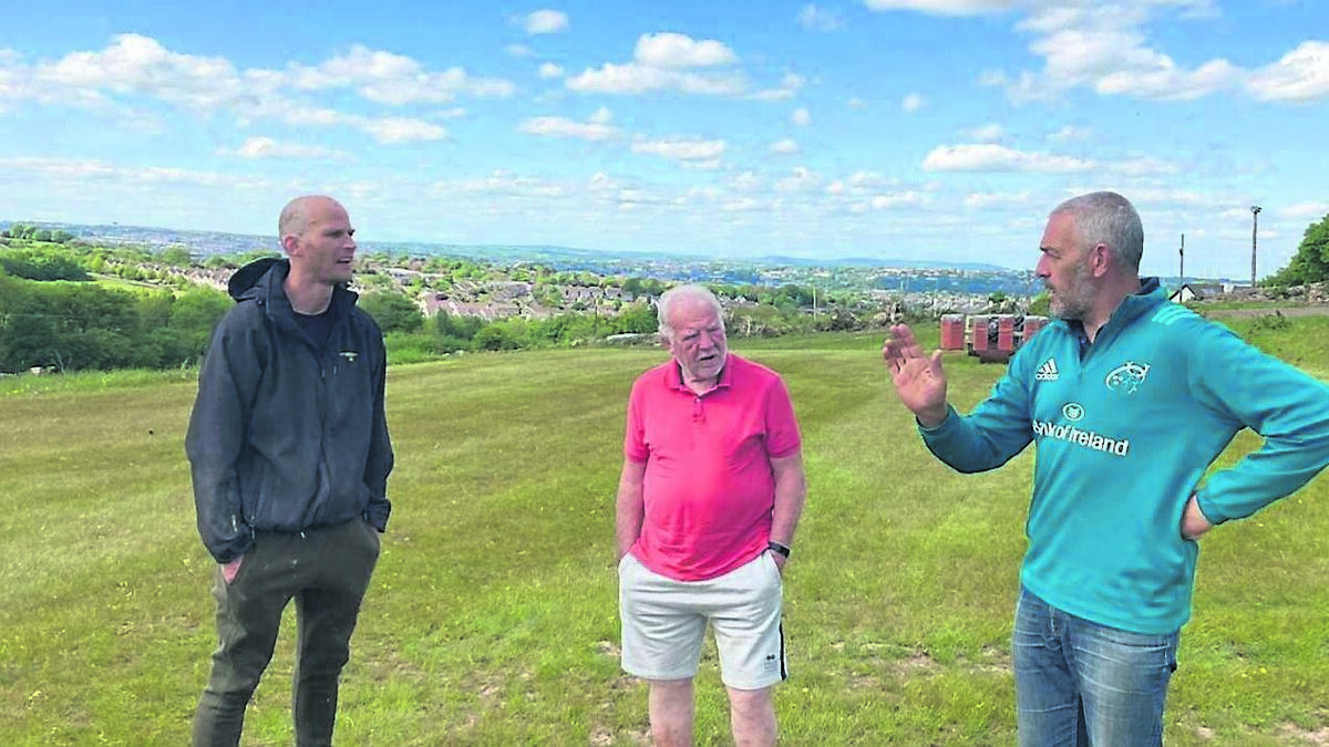 Douglas RFC grounds keeper, Rogan Gee, club member Tom O’Mahoney, and Seamus O’Flynn, youth co-ordinator.