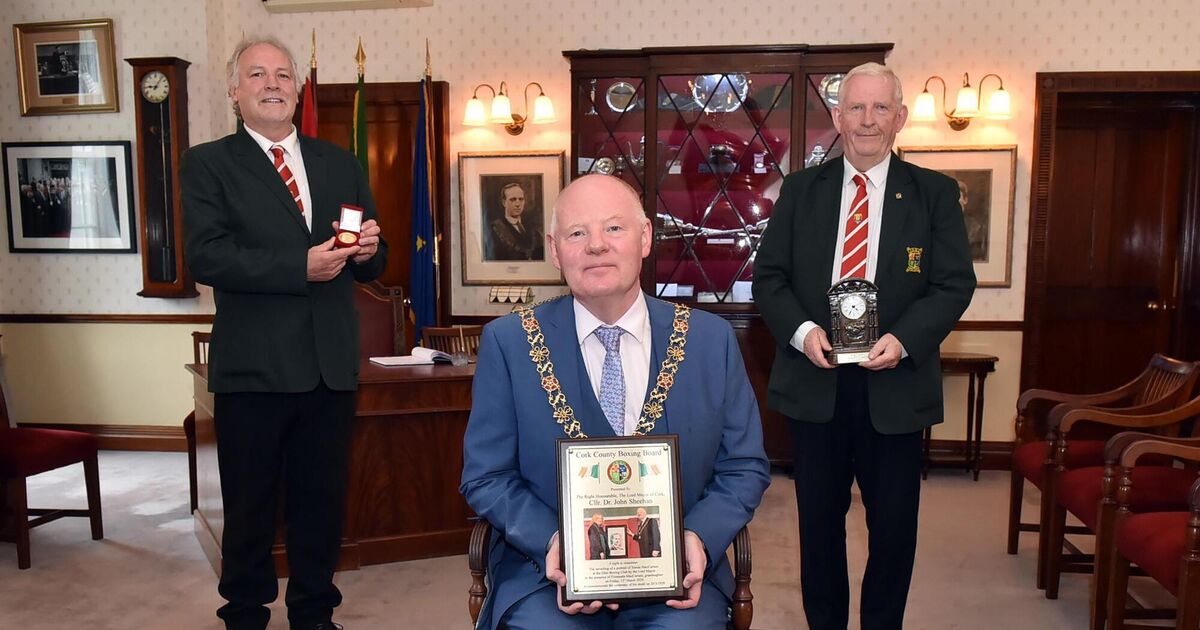 THE Lord Mayor of Cork, Dr John Sheehan, welcomed a delegation from Cork boxing to City Hall on Tuesday in his last week in office.