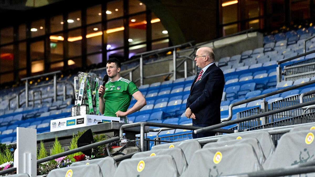 Limerick captain Declan Hannon during his acceptance speech after the GAA Hurling All-Ireland Senior Championship Final match between Limerick and Waterford at Croke Park in Dublin. Photo by Piaras Ó Mídheach/Sportsfile