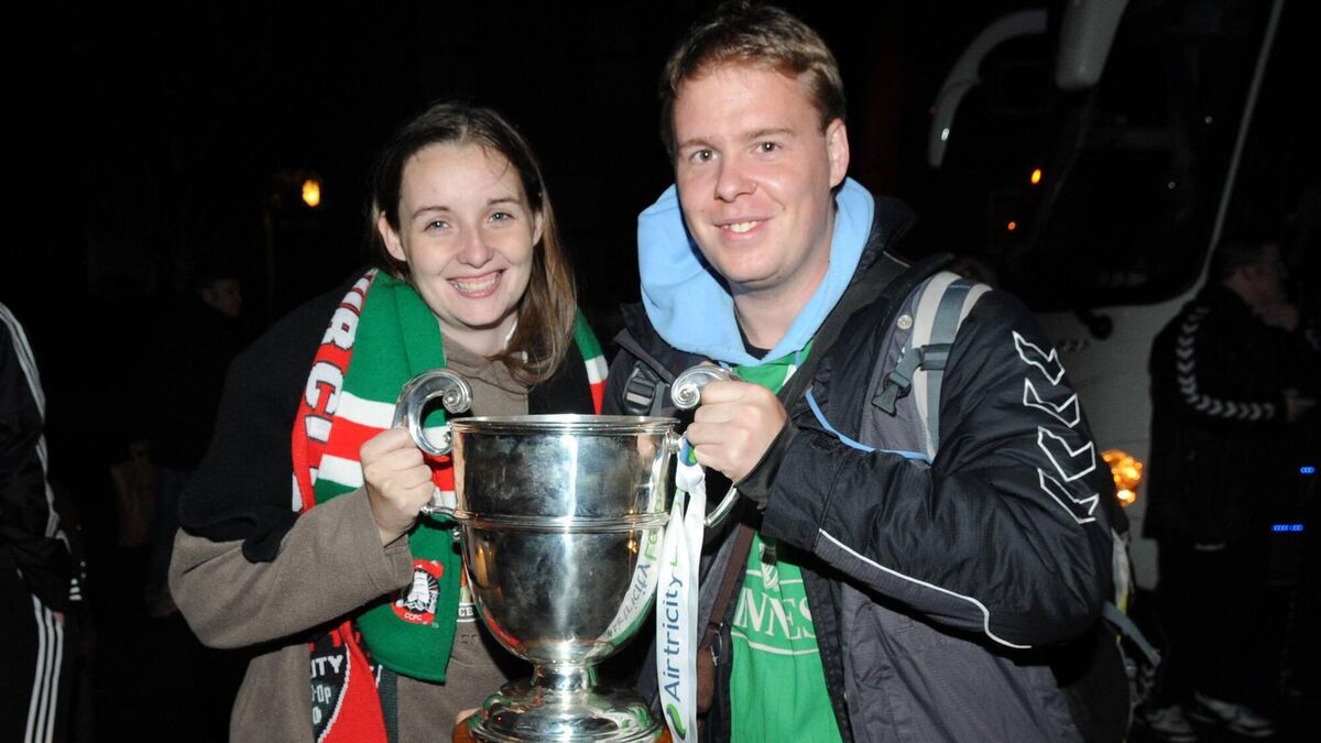 Cork City fans Gavin Golden and Trina Boyle after making the trip from Bangkok to support Cork City, with the First Division trophy after the win over Shels. Picture: Eddie O'Hare