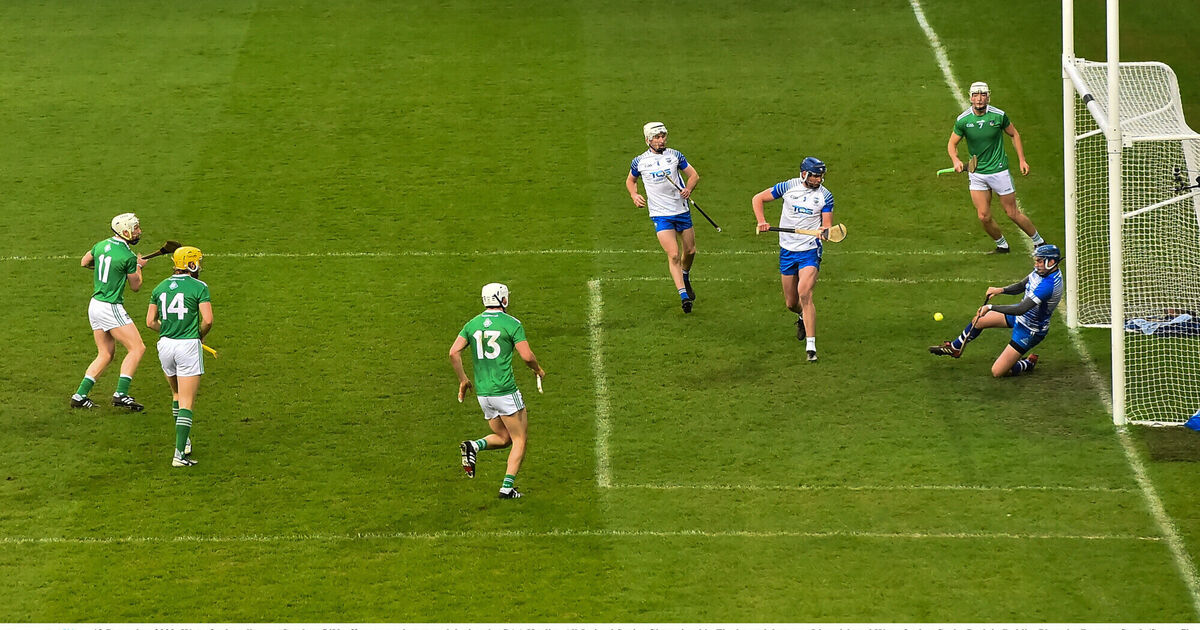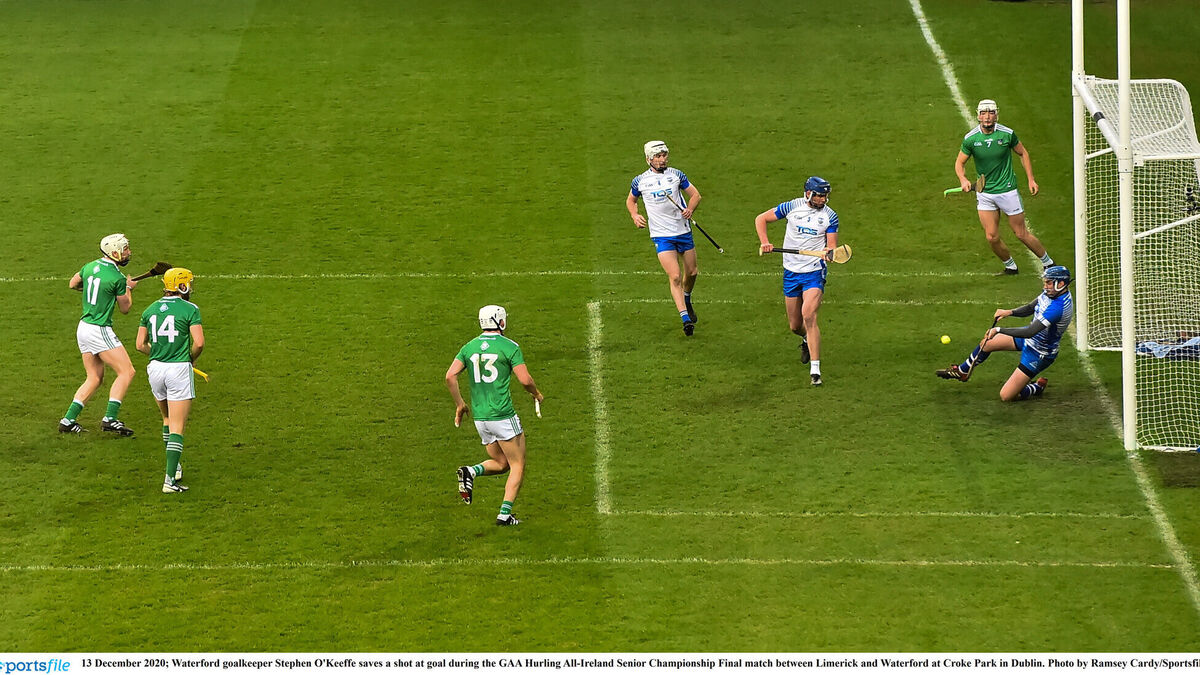 Waterford goalkeeper Stephen O'Keeffe prevents a goal against Limerick, who hit so many points they never needed to raise a green flag. Picture: Ramsey Cardy/Sportsfile
