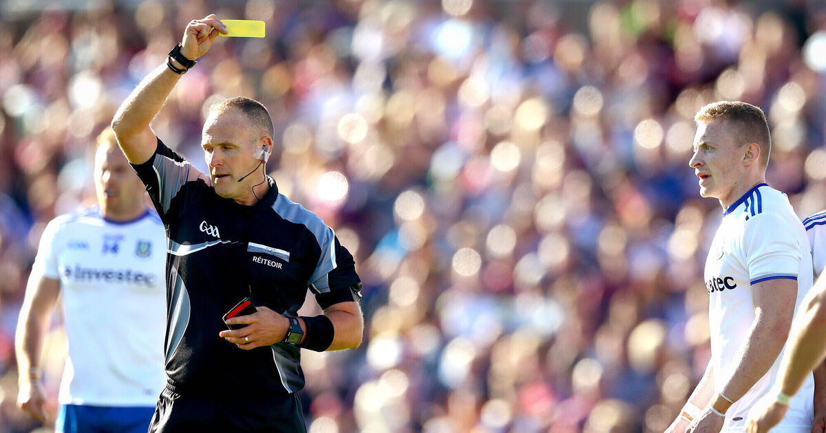 Monaghan's Colin Walsh is yellow carded by Cork referee Conor Lane. Picture: INPHO/Ryan Byrne