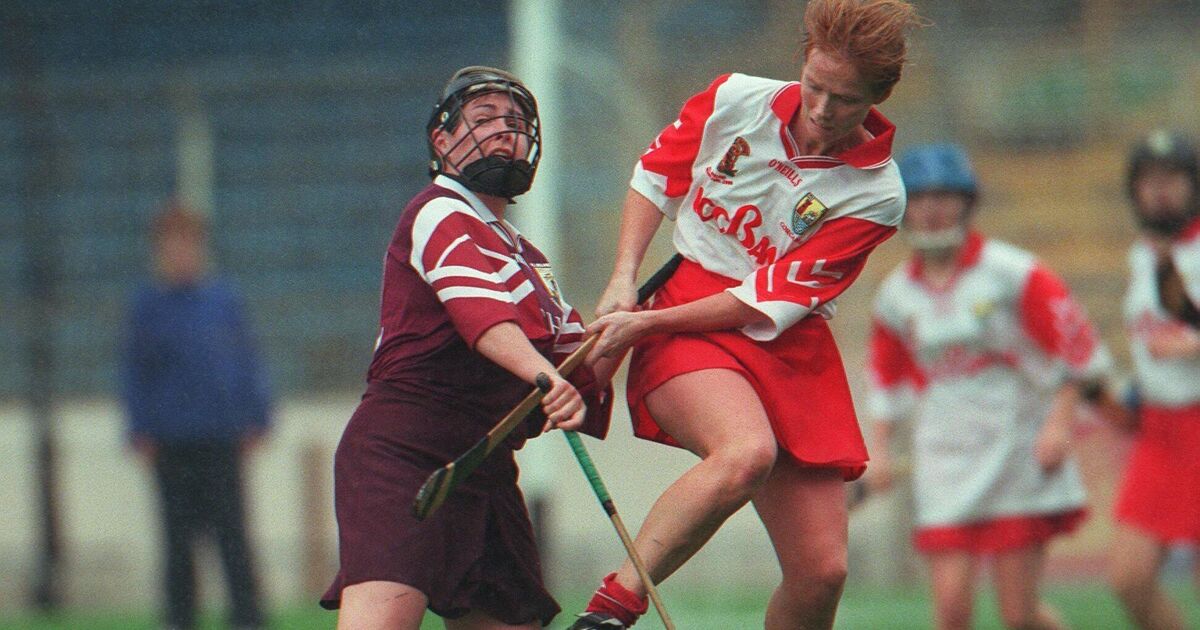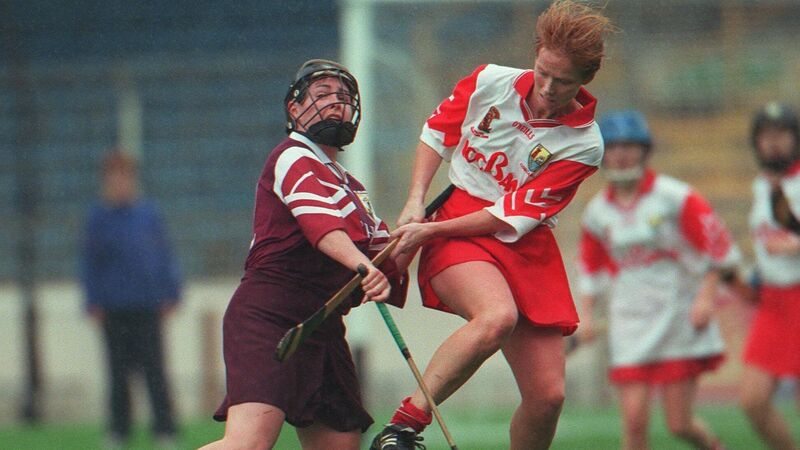 Linda Mellerick of Cork and Olivia Broderick of Galway battling it out in 1998. Picture: INPHO/Lorraine O'Sullivan
