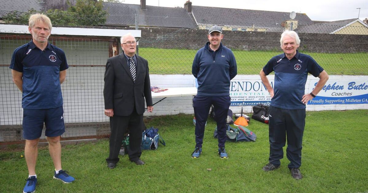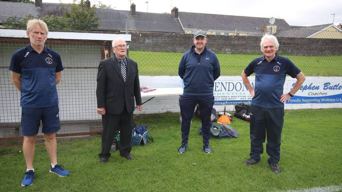 Joe Quinn with the Carraig na bhFear junior hurling selectors before the 2019 final: Pat O'Brien Joe Quinn, Joe Delaney and Mick O'Connell.