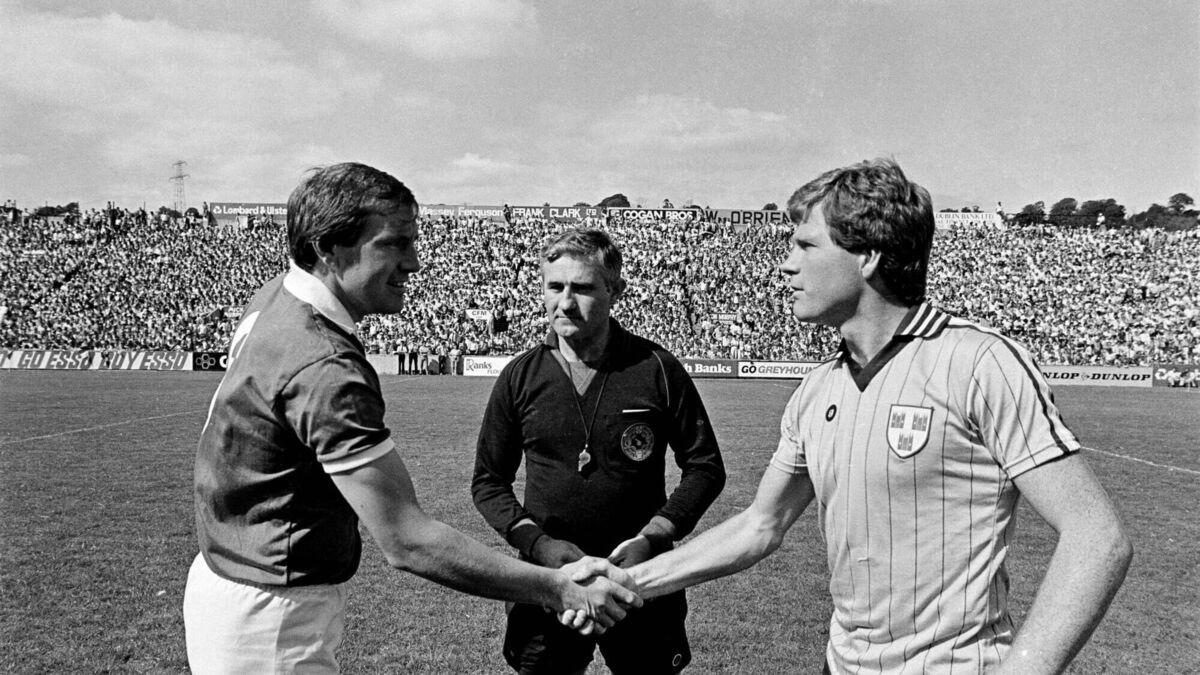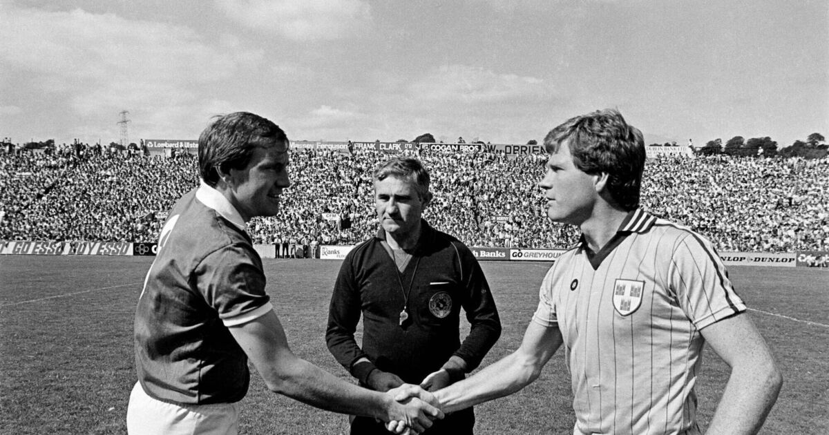 Dublin captain Tommy Drumm, right, shakes hands with Cork captain Christy Ryan, while referee PJ McGrath looks on before the 1983 All-Ireland football semi-final replay at Páirc Uí Chaoimh. Picture: Ray McManus/SPORTSFILE