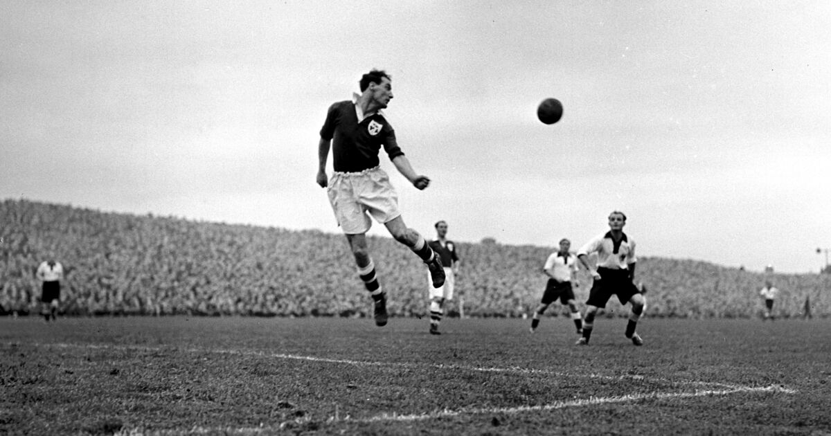 Florrie Burke clears the ball during Ireland v Germany soccer international at Dalymount Park in 1951.