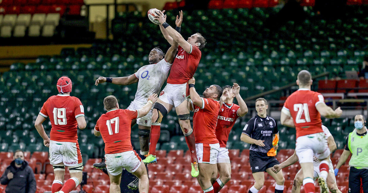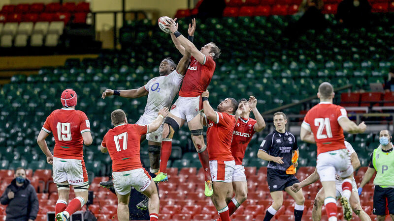 England's Maro Itoje competes in the air with Alun Wyn Jones of Wales in the Six Nations clash. Picture: INPHO/Laszlo Geczo
