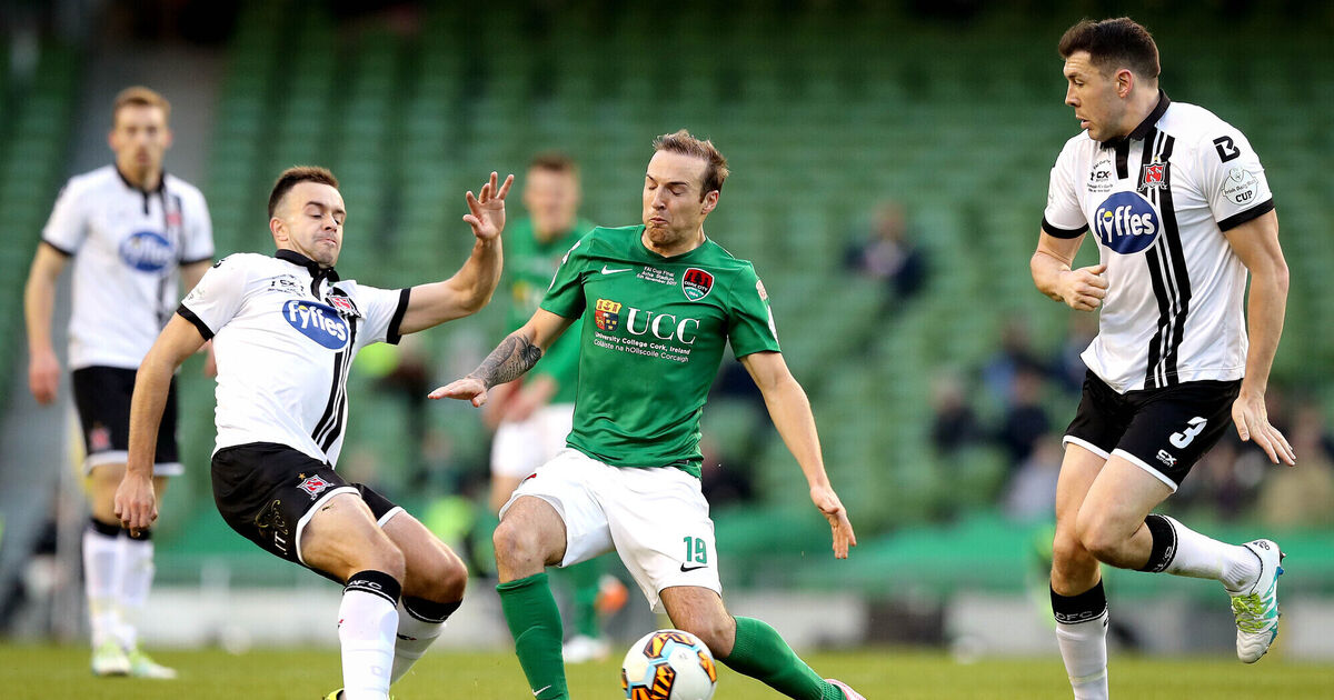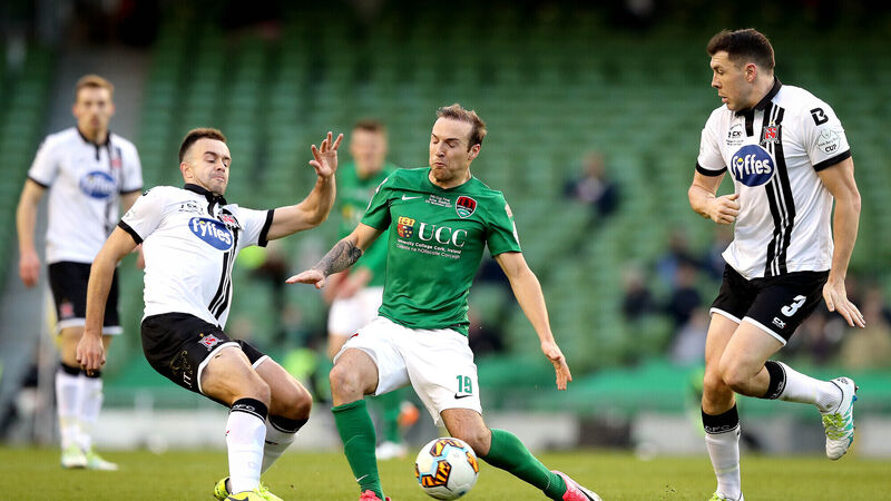 Dundalk's Robbie Benson and Brian Gartland with Karl Sheppard of Cork City in the 2017 FAI Cup final. Picture: INPHO/Ryan Byrne