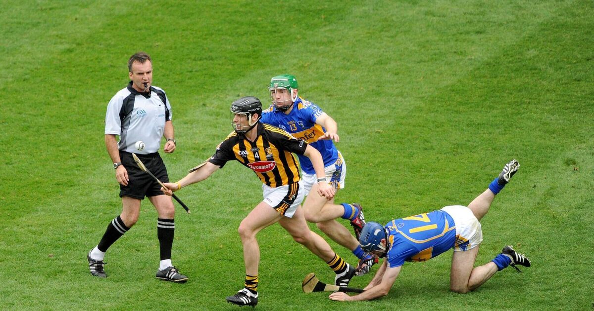 Jackie Tyrell, Kilkenny, slips past referee Diarmuid Kirwan as he prepares to clear from Tipperary forwards Noel McGrath and Eoin Kelly in 2009. Picture: Ray McManus/SPORTSFILE
