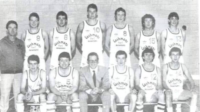 The Crosshaven basketball team that won promotion in the 1980s: Back: Coach John O’Leary, John Ronayne, Seamus Finucane, Don Howell (American player), Ger Lyall, Freddie Richmond, Tony Collins. Front: Kieran Fitzgerald, Jim Crowley, Liam Cashman (sponsor), Pat O’Flynn, Pat Maher, Eammon O’Donovan.