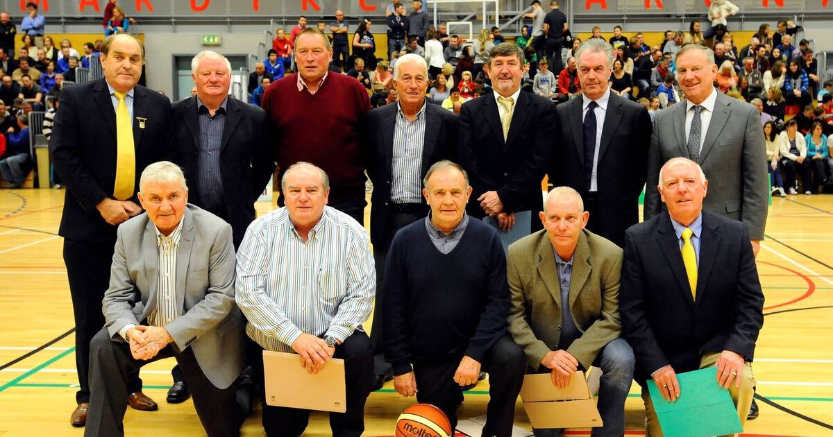 2013 saw the 40th year team reunion of the Blue Demons Basketball team, National League Champions 1973. Front from left, Peter Coughlan, John Cooney, Sean Murphy, Dominick Dalton, and Dan Byrne; standing: Gerry Kelly, Pres Basketball Ireland, Noel McCarthy, Andrew Houlihan, Aidan Horgan, Joe Coughlan, Barry Deasy and Sean O’Sullivan, at the Mardyke Arena.