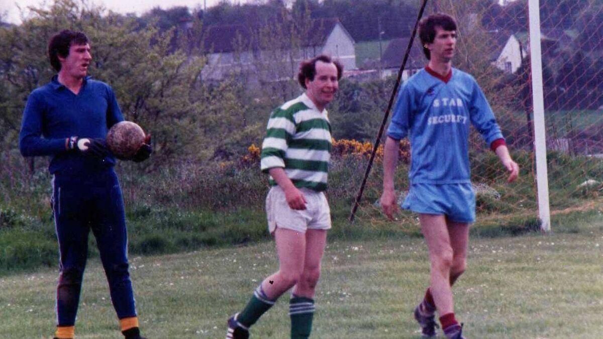 Roches Stores’ Man of the Match keeper Liam O’Callaghan prepares to set up another attack during the Byrne Cup final on Sunday, May 18, 1986 as Finbarr O’Brien (Roches) and John Reid (Postal Workers) await developments. Picture: Sean O’Neill.