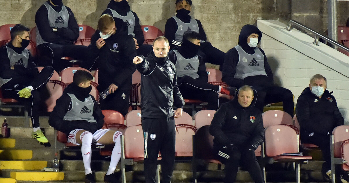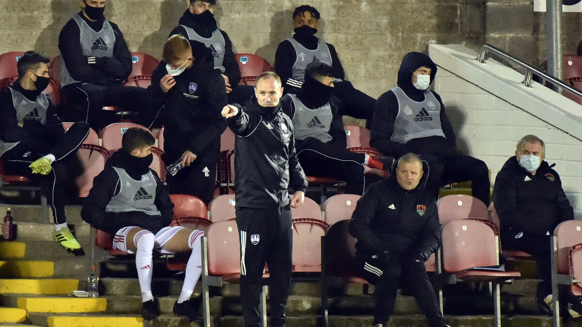 Cork City manager Colin Healy pointing the way from the newly located dugouts against Cobh Ramblers on Friday night. Picture: Eddie O'Hare