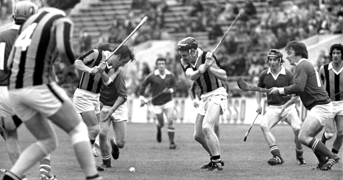 Cork and Kilkenny met for the opening of Páirc Uí Chaoimh on June 6, 1976, with /Kilkenny defenders Larkin and Pat Henderson clearing their line watched by Cork's Pat Moylan, John Fenton and Sean O'Leary