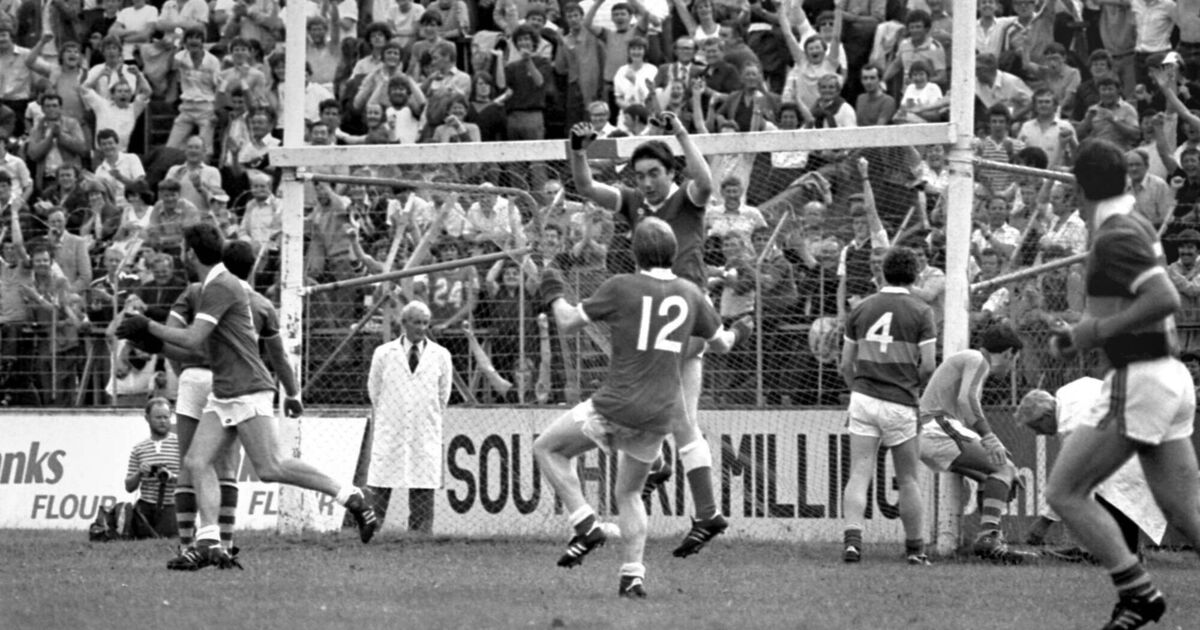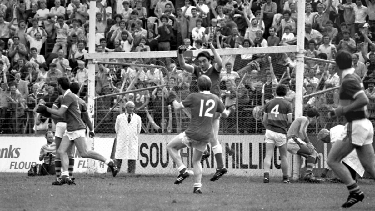 Cork wing-forward Tadgh Murphy celebrates scoring with Dave Barry, while Kerry goalkeeper Charlie Nelligan disputes the decision in the 1983 Munster football final.
