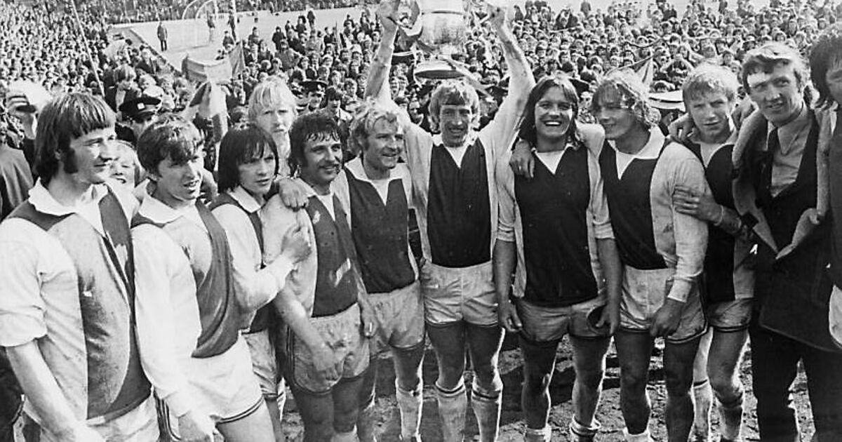 Cork Hibs and Dinny Allen celebrate after winning the FAI Cup in 1973. From left, John Brohan, Frankie Connolly, Carl Humphries, Declan O'Mahony (goalie slightly behind), John Lawson, Sonny Sweeney, Dave Bacuzzi, Gerry Coyne, Dave Wiggington, Dinny Allen, Noel O'Mahony (in suit), Martin 'Fada' Sheehan.