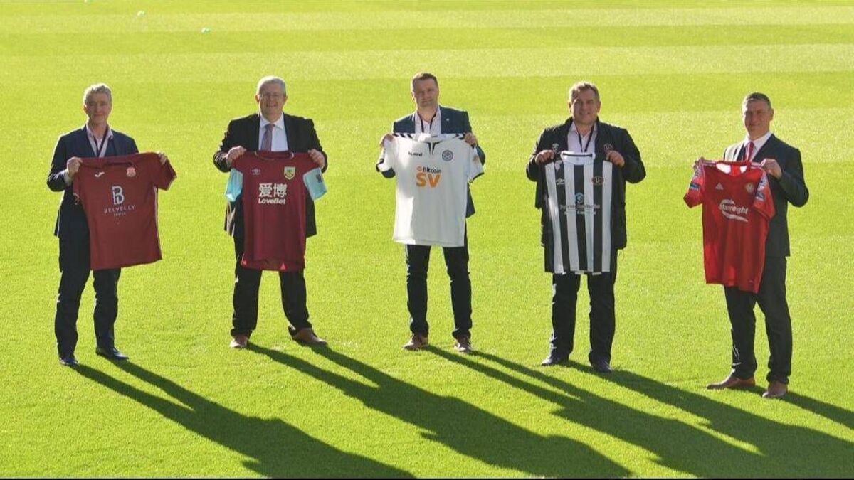 Cobh Ramblers chairman Bill O'Leary, with Burnley chief operating officer Matt Wiliams and represenatives of Welsh side Llandudno, Scotland's Ayr United, and Northern Ireland's Portadown at yesterday's partnership announcment at Turf Moor.