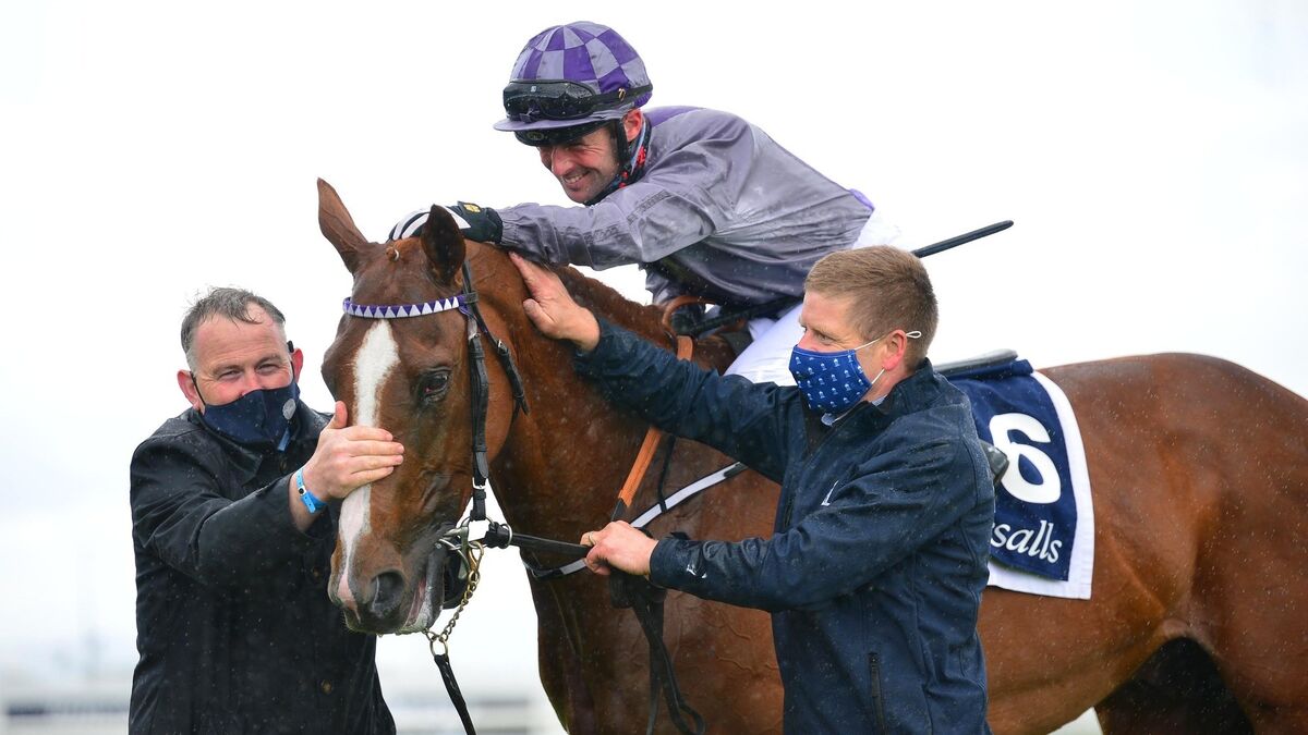 Mac Swiney and Rory Cleary with grooms John Hayes and Ger Flynn after their win for trainer Jim Bolger. Picture: Healy Racing.