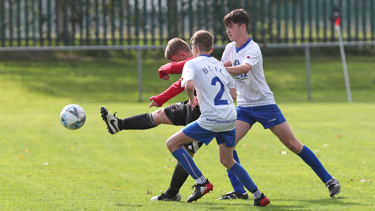 Adam O'Callaghan, Ringmahon Rangers, clears from Cian Lawless and Luke Philpott, Blarney United, in the CSL U15 tie. Picture: Jim Coughlan.
