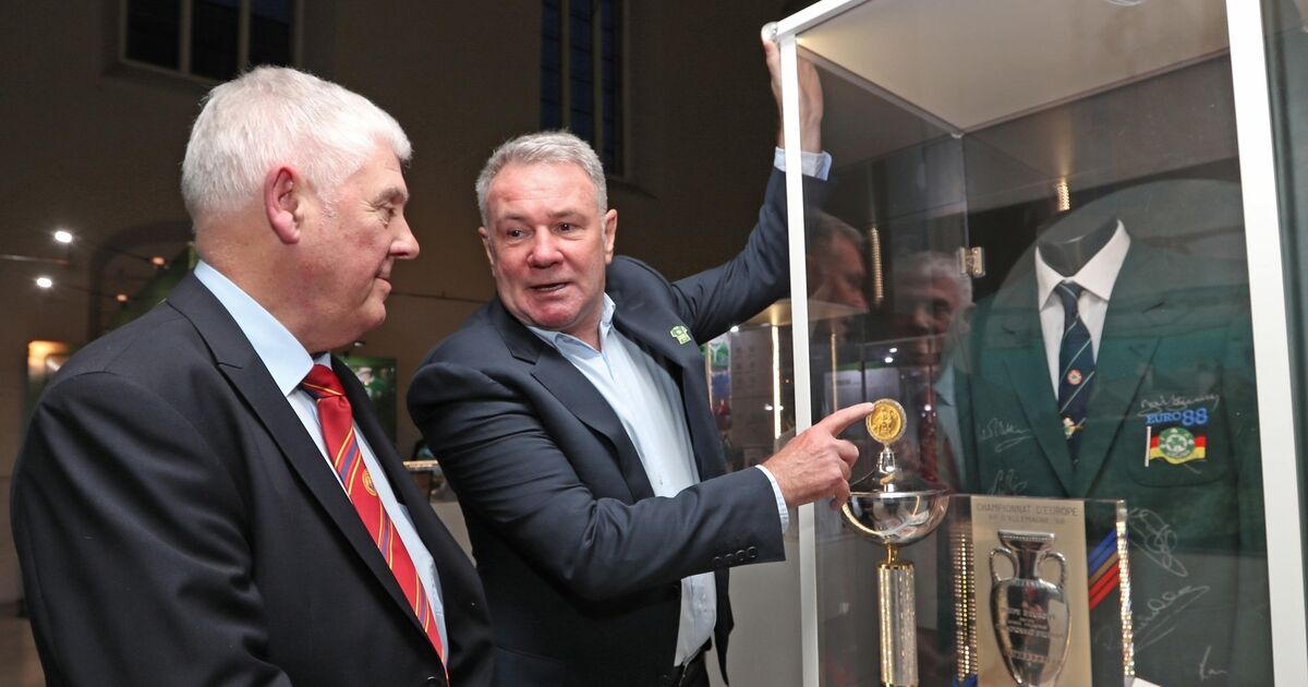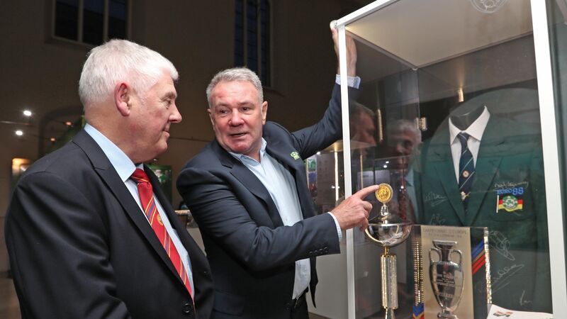 Ted O'Mahony, Cork AUL stalwart with Ray Houghton at an FAI Exhibition, at St Peter's. Picture: Jim Coughlan.