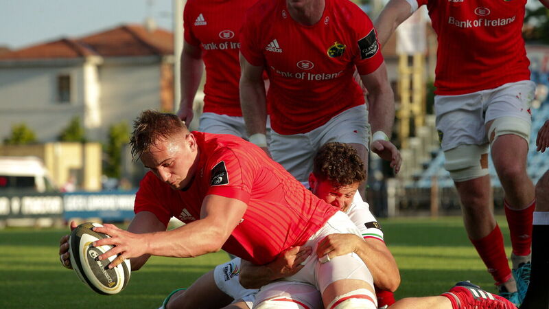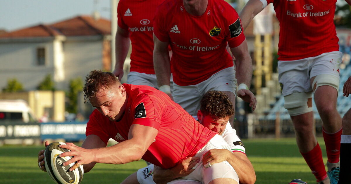 Gavin Coombes of Munster scores a try during the Guinness PRO14 Rainbow Cup match between Zebre and Munster at Stadio Lanfranchi in Parma, Italy. Photo by Roberto Bregani/Sportsfile
