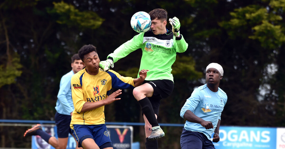 Avondale United goalkeeper Michael O'Neill heads clear from Douglas Hall's Tyrone Johnson during the Daly Industrial Supplies Premier U18 game at Avondale Park. Picture: Eddie O'Hare