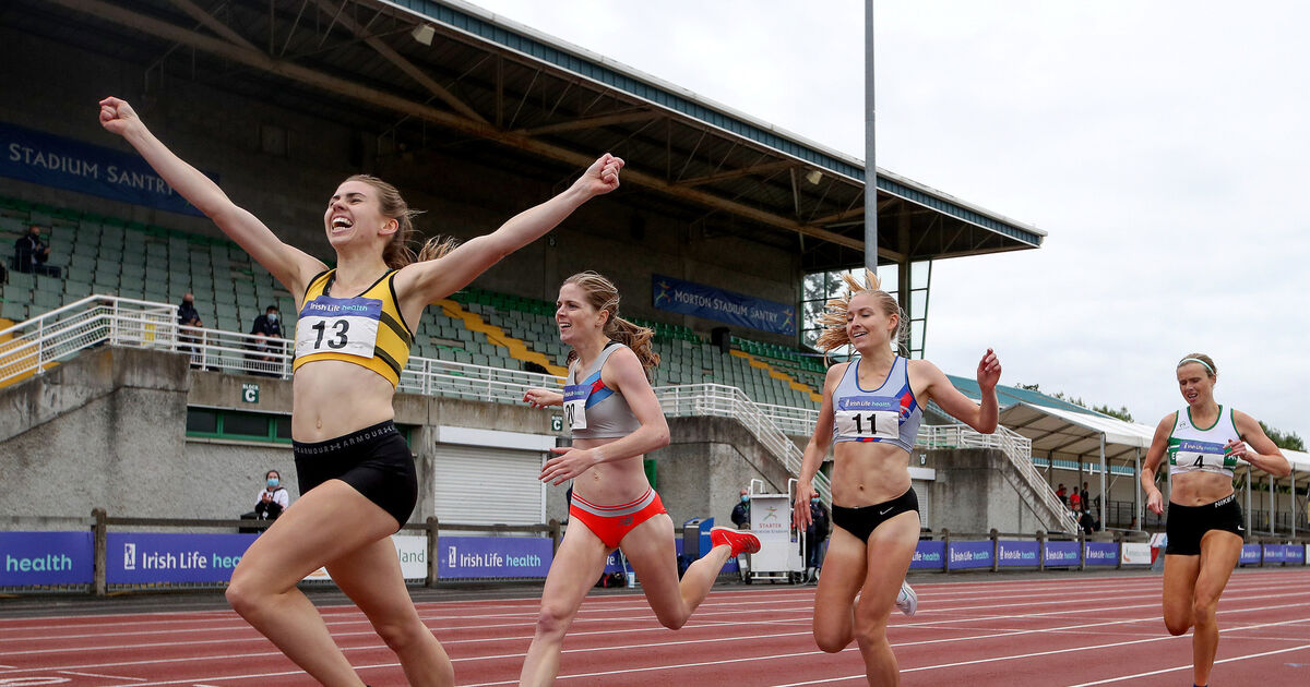 Louise Shanahan of Leevale A.C celebrates winning the 800m ahead of Siofra Cleirigh Buttner of Dundrum South Dublin, Georgie Hartigan of Dundrum South Dublin A.C, Jenna Bromell of Emerald AC. Picture: INPHO/Bryan Keane