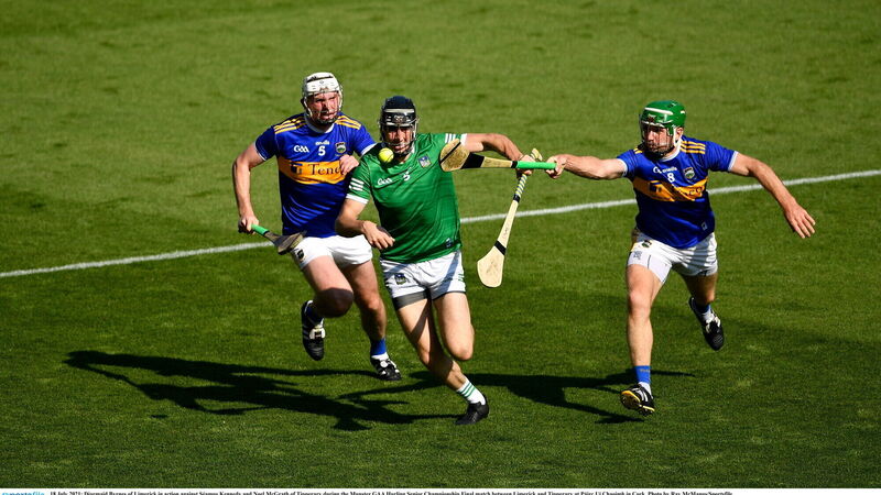 Diarmaid Byrnes of Limerick in action against Séamus Kennedy and Noel McGrath of Tipperary. Picture: Ray McManus/Sportsfile
