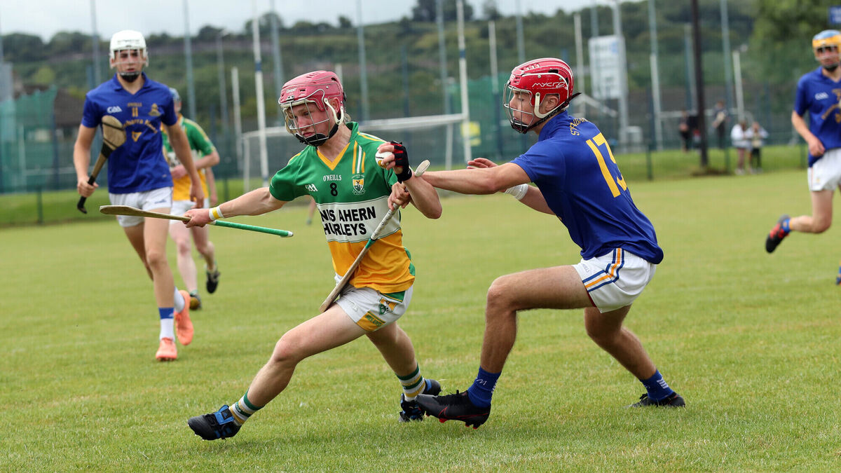 David Barry, Bride Rovers, battles William Buckley, St Finbarr's, in a recent Rebel Óg Minor Hurling tie. Picture: Jim Coughlan.