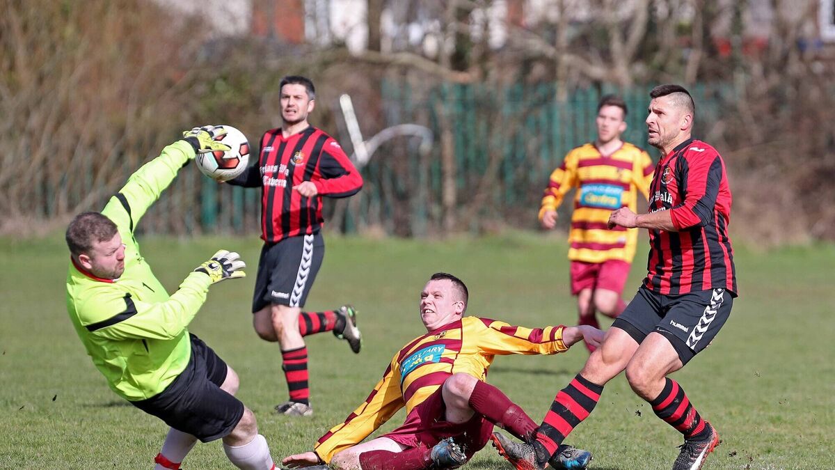 Stephen Barry, Tramore Athletic, has his shot saved by Darren Haines (Casement Celtic goalkeeper) under pressure from Piotr Sekula, Casement Celtic, in 2018. Picture: Jim Coughlan.