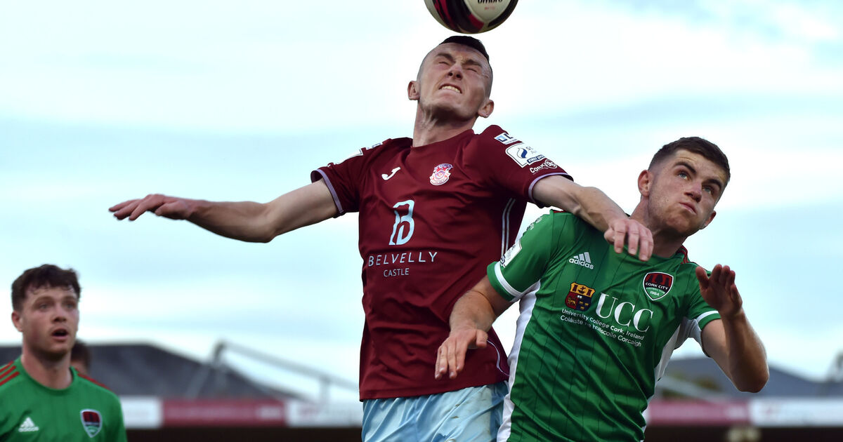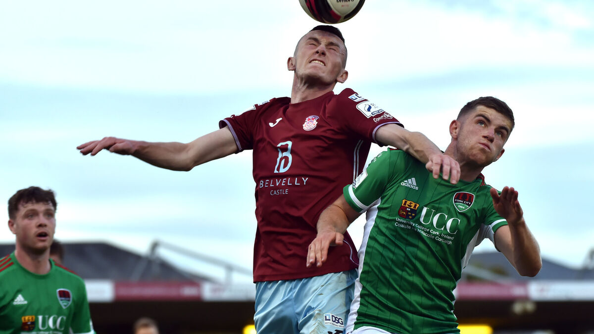 Cobh Ramblers' Lee Devitt heads away from Cork City's Darragh Crowley during the SSE Airtricity First Divison game at Turner's Cross. Picture: Eddie O'Hare