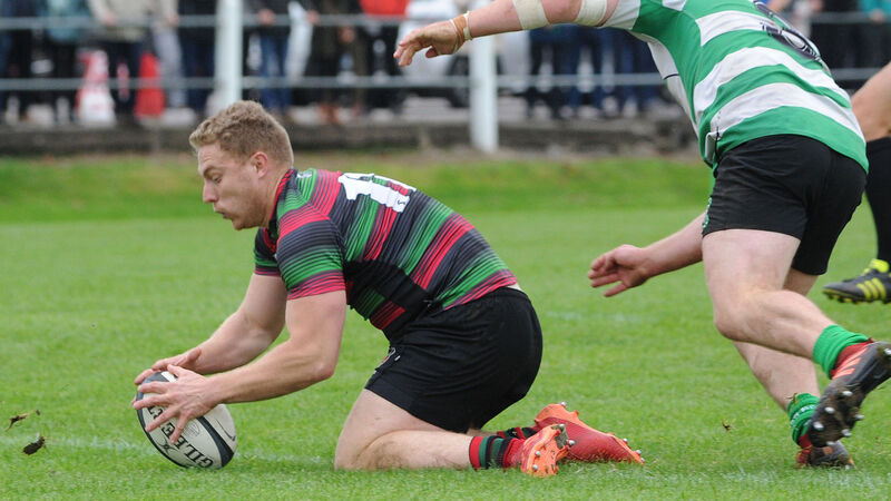Highfield's Paul Stack scoring a second-half try against Naas in the All Ireland League Division 1B game at Woodleigh Park. Picture: Denis Minihane.