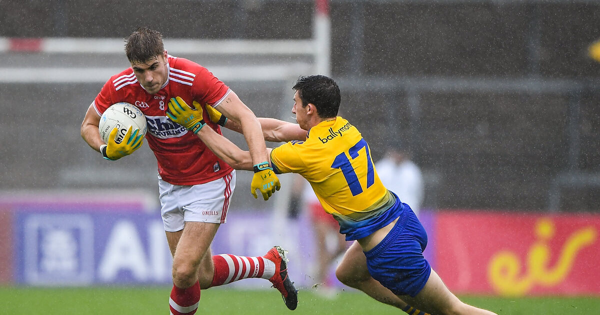 Rain-soaked Super 8 action in 2019, with Ian Maguire of Cork holding off Colin Compton of Roscommon at Páirc Uí Rinn. Picture: Matt Browne/Sportsfile