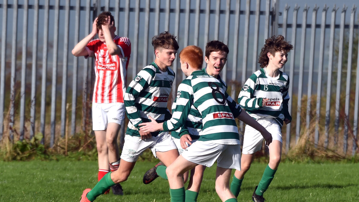 Kanturk's Noah Bailey celebrates his second goal with Jamie Eustace against Castleview during the Joma/Sportsgear Direct U16 Division 4 clash. Picture: Eddie O'Hare