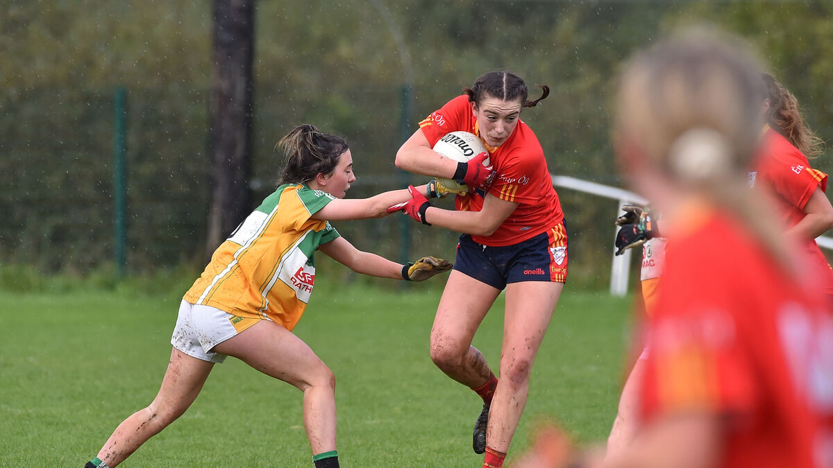 Sadhbh McGoldrick, Éire Óg, looking to evade the tackle of Ava Barry, Bride Rovers, in their Senior A LGFA semi-final at Ovens. Picture: Dan Linehan