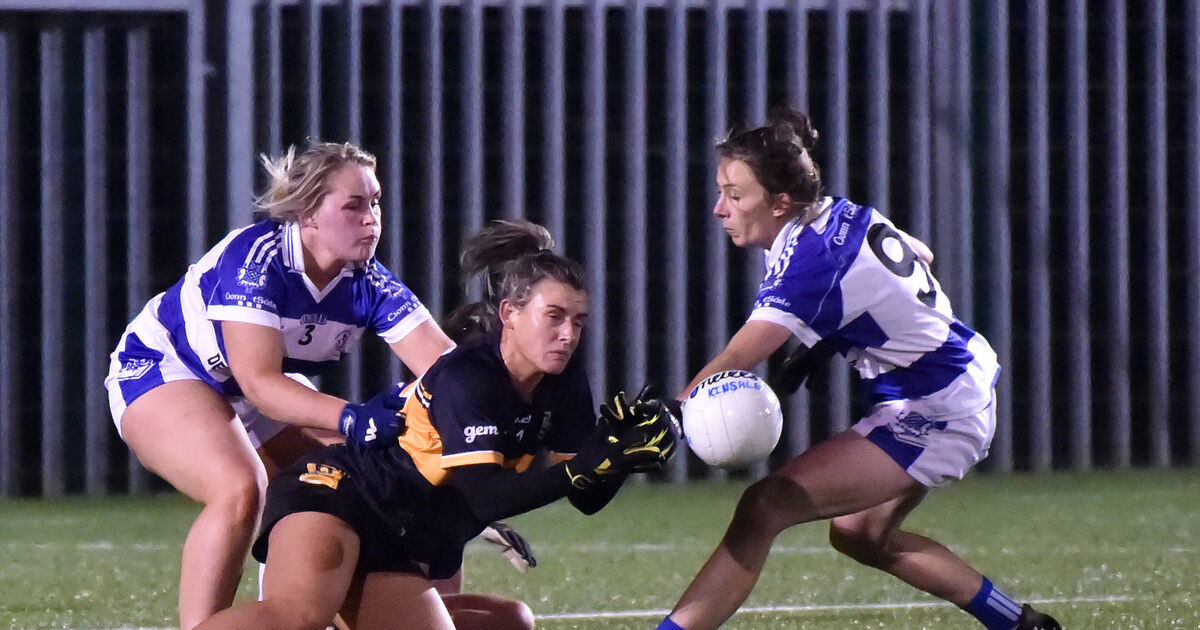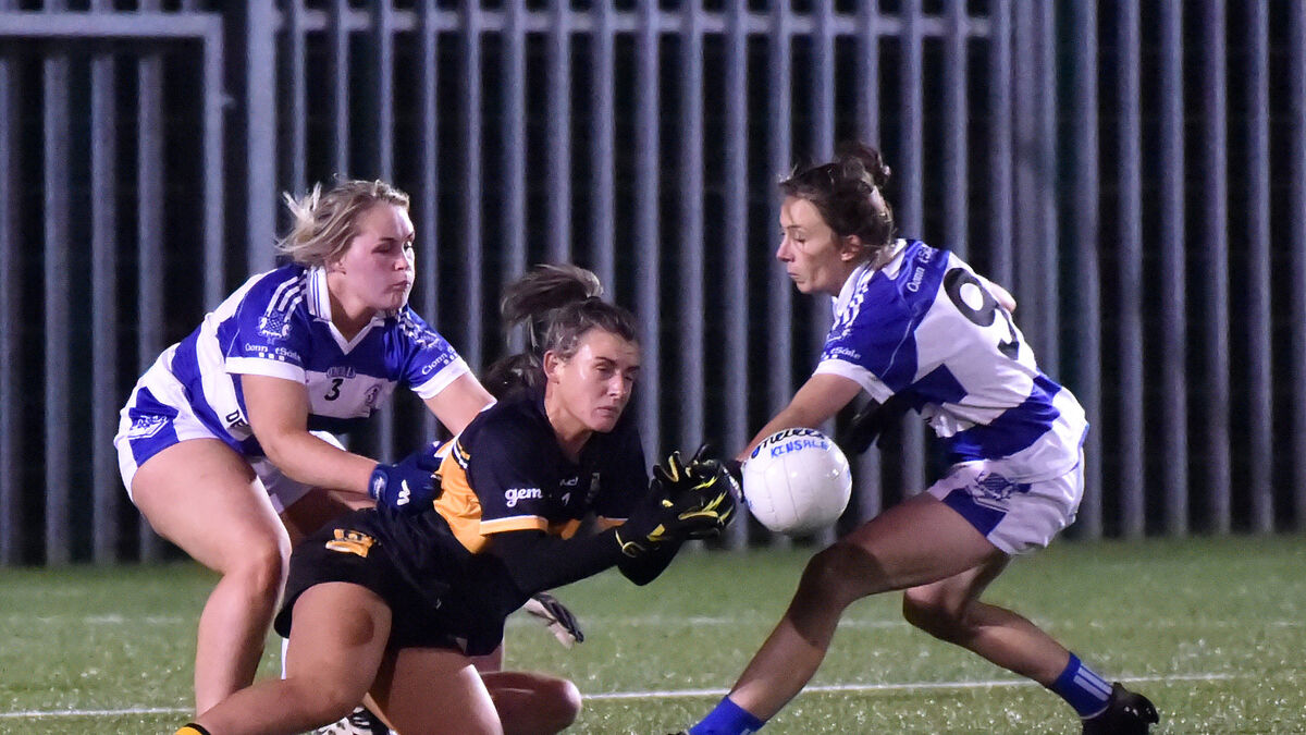 Mourneabbey's Doireann O'Sullivan gets off her pass from Kinsale's Emma O'Brien and Nicole Quinn during the Senior A LGFA semi-final at Bishopstown. Picture: Eddie O'Hare