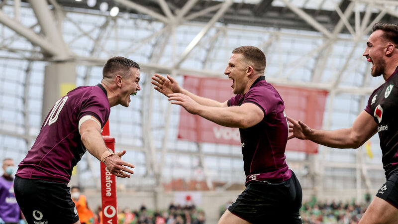 Johnny Sexton celebrates after scoring a try on his 100th cap for Ireland with Andrew Conway. Picture: INPHO/Dan Sheridan