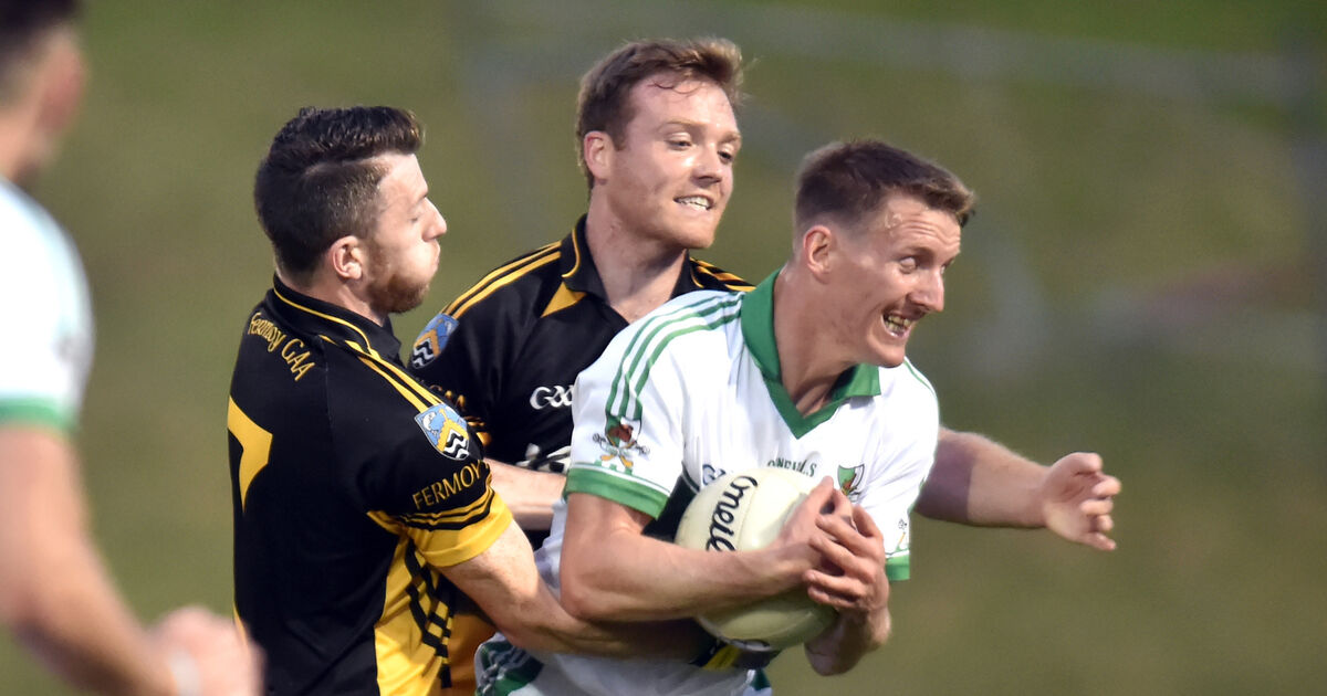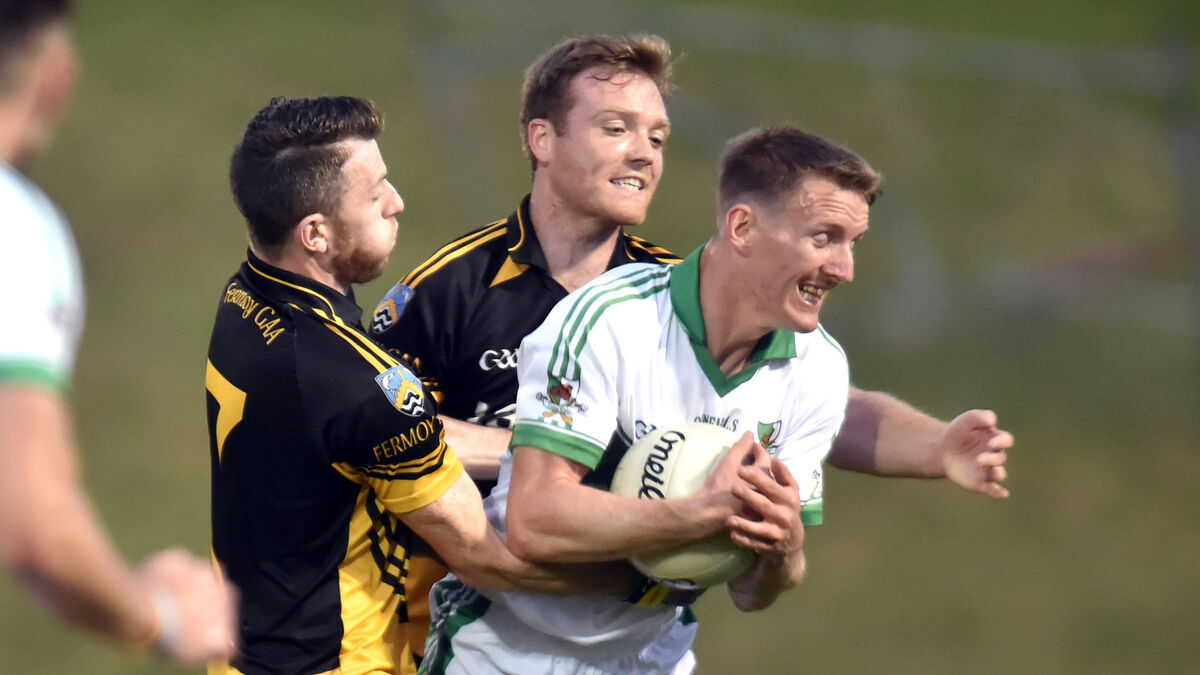Kanturk veteran John McLoughlin is tackled by Fermoy's Alan Baragry and Darragh O'Carroll. Picture: Eddie O'Hare