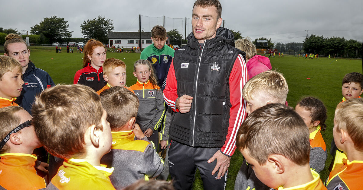 Pictured at the Watergrasshill GAA Cúl Camp, Cork Hurler Colm Spillane as he tells the youngsters about his experiences in the GAA. Picture: Andy Jay