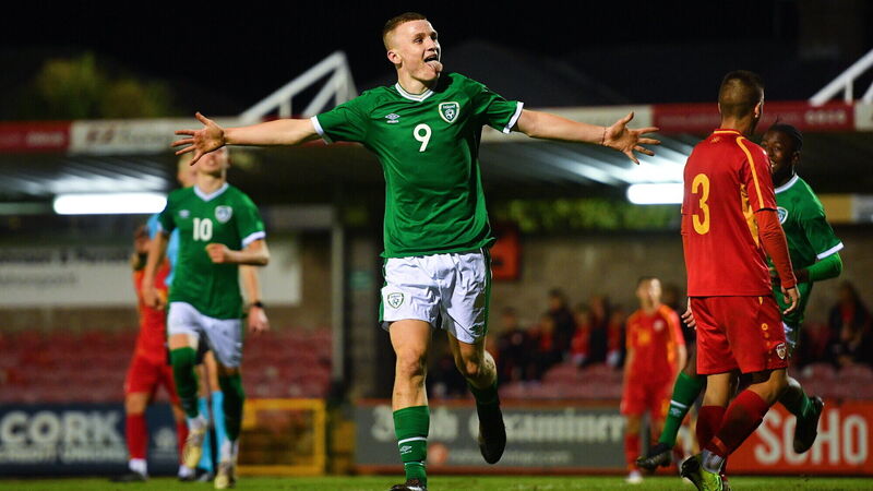 Mark O'Mahony of Republic of Ireland celebrates after scoring his side's second goal during the UEFA U17 Championship Qualifying Round Group 5 match between Republic of Ireland and North Macedonia at Turner's Cross in Cork. Photo by Eóin Noonan/Sportsfile