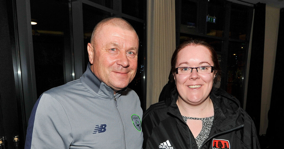 Dave Bell, FAI development officer for Cork and Erika Ni Thuama, FAI football enterprise co-ordinator with Cork City FC, enjoying the launch of the Cork City FC amputee team at the Cork International Hotel in Cork Airport.