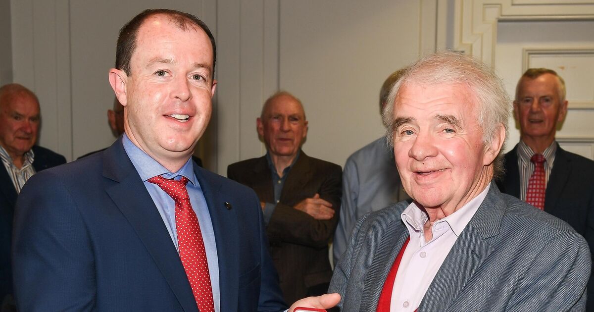 Team member Joe O'Keeffe is presented with his medal by Cork County Board chairman Marc Sheehan. Sadly weeks after the dinner Joe passed away suddenly. Picture: David Keane