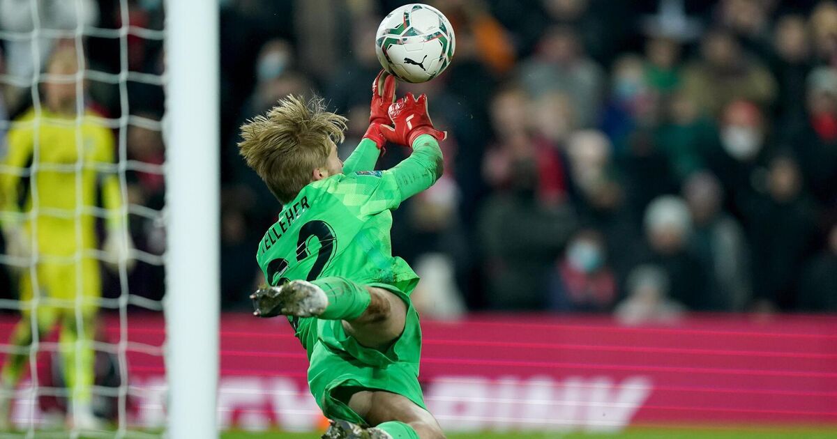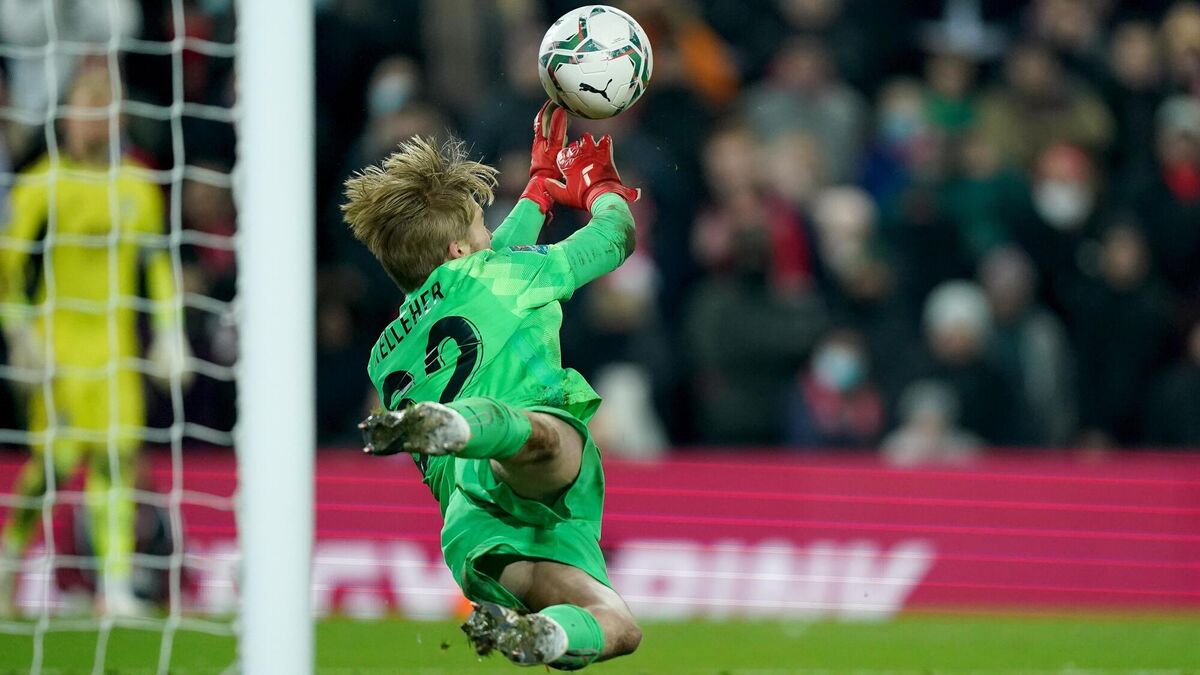 Liverpool goalkeeper Caoimhin Kelleher makes a save during the penalty shoot out during the Carabao Cup quarter final match at Anfield, Liverpool. Picture date: Wednesday December 22, 2021.