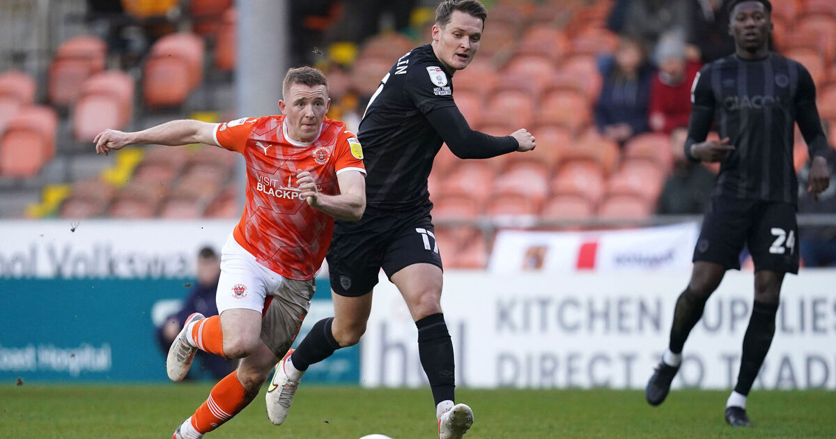 Blackpool's Shayne Lavery (left) and Hull City's Sean McLoughlin in action during the Sky Bet Championship match at Bloomfield Road Stadium, Blackpool. Picture date: Saturday January 1, 2022. PA Photo