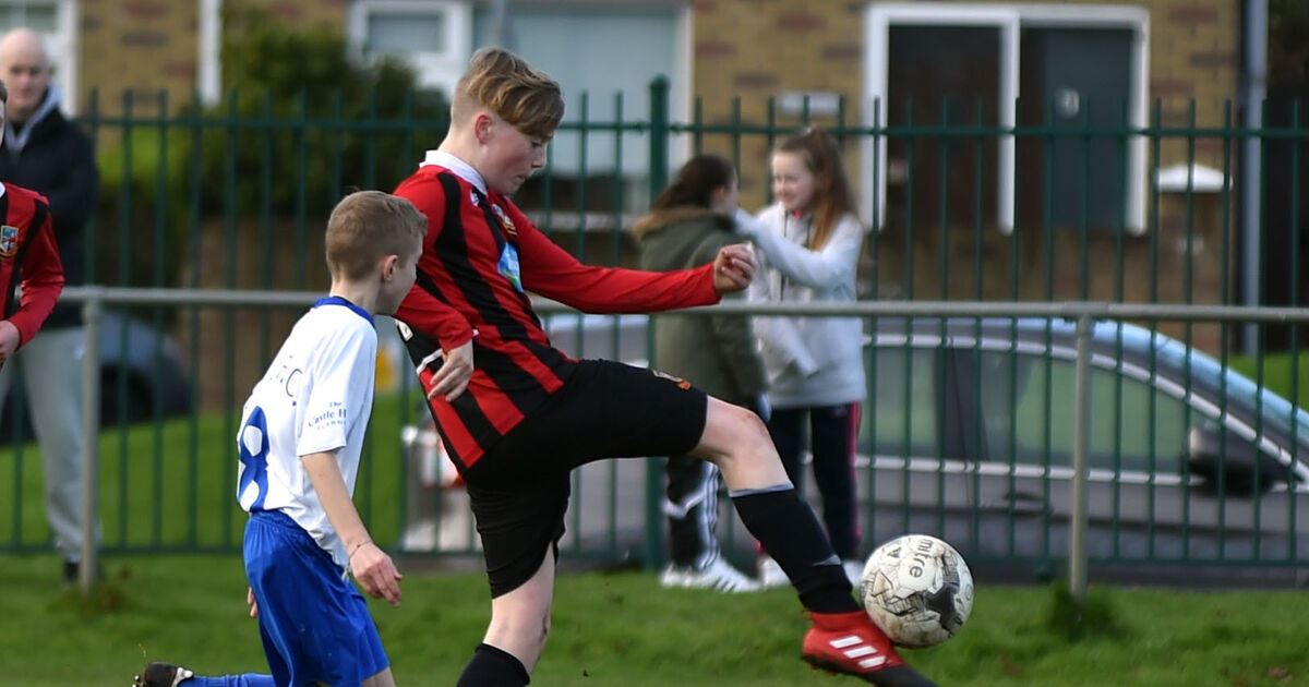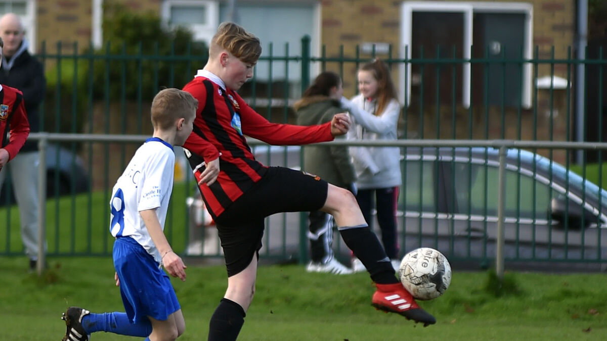 Former Ringmahon Rangers defender Cathal Heffernan clears from Blarney United's Arran Healy in an U13 CSL game in 2017. Picture: Eddie O'Hare