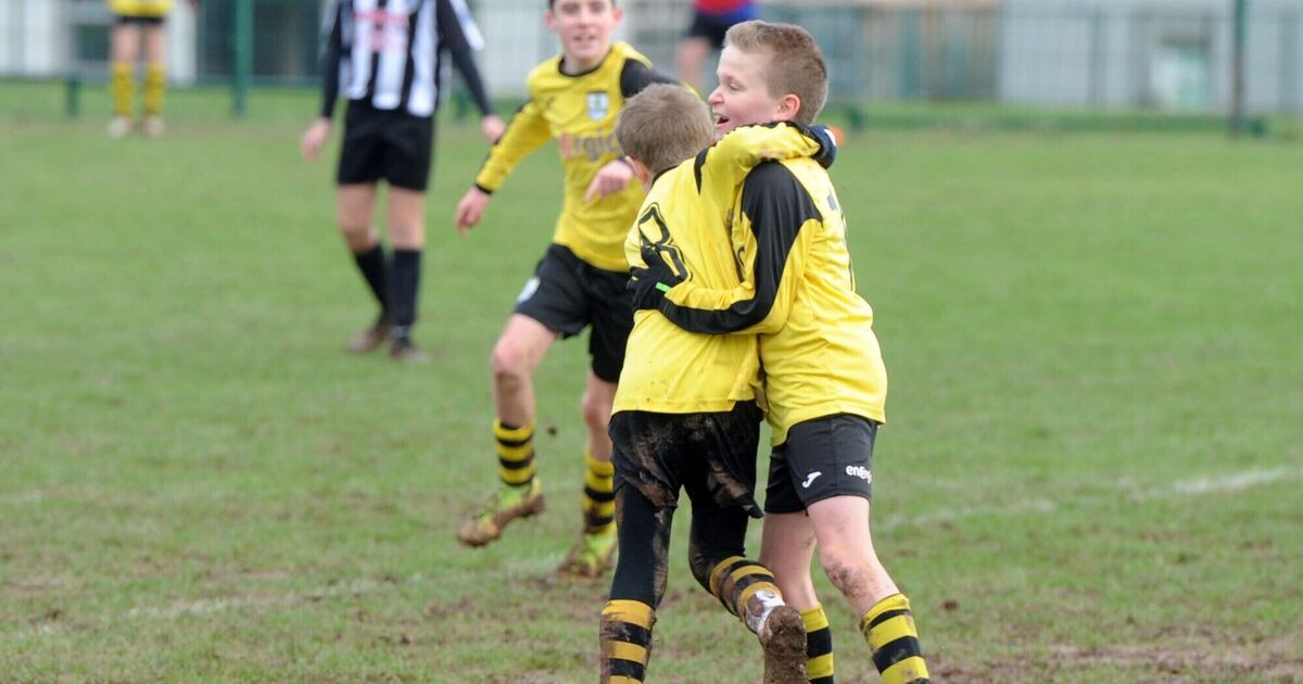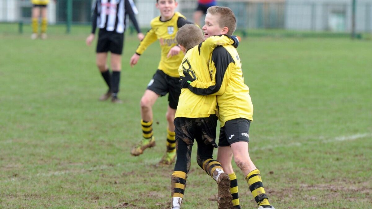 Riverstown's Matthew Madden being congratulated after scoring a goal against St. Mary's in the Blackwater Motors Under 12 Local Cup at St. Mary's Park.