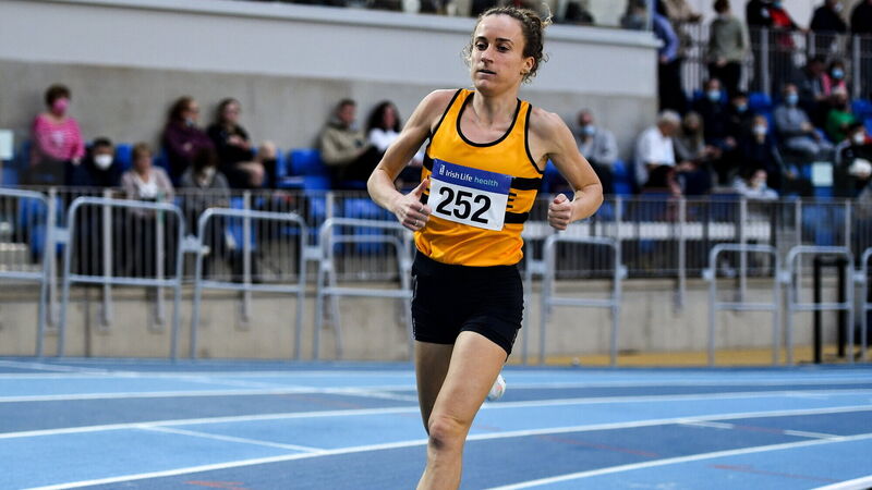 Michelle Finn of Leevale AC, Cork, on her way to winning the women's 3000m during the AAI National Indoor Games & Indoor League Final at the National Indoor Arena, Sport Ireland Campus in Dublin. Photo by Sam Barnes/Sportsfile