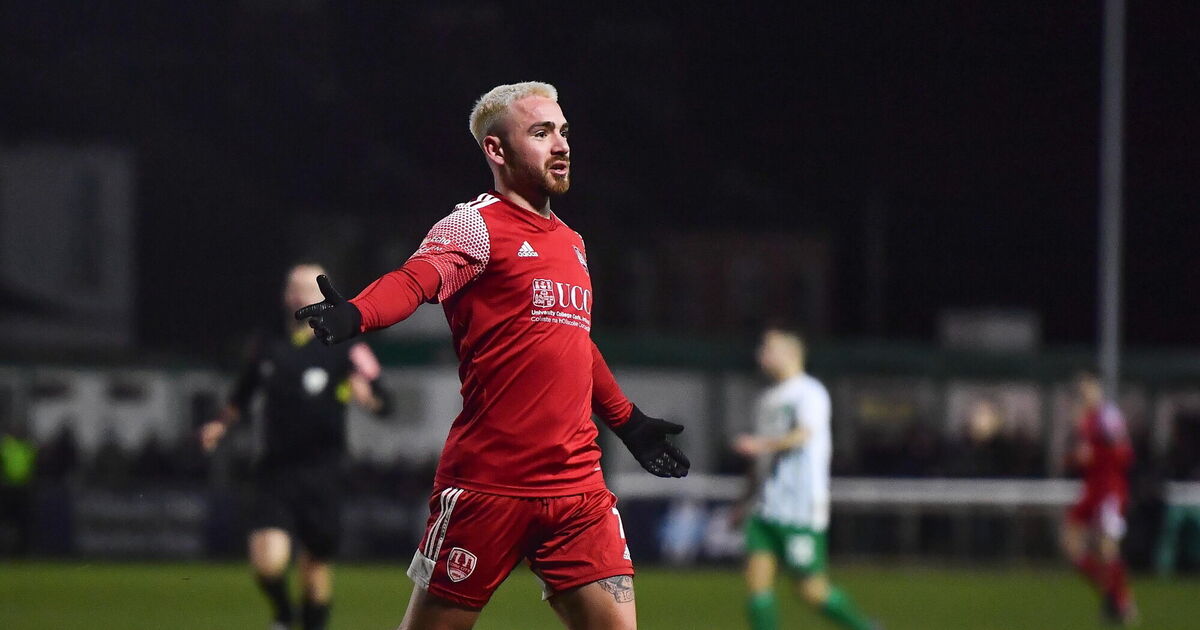 Dylan McGlade of Cork City celebrates after his side's fifth goal and sealing his hat-trick at Carlisle Grounds on Friday night. Picture: David Fitzgerald/Sportsfile